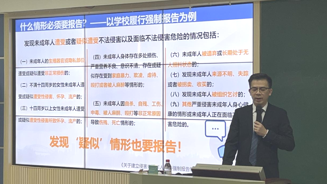 在本次课程中,郑律师对“强制报告”的定义、主体、如何报告、履职保障等内容进行了详细解释,并用了大量的实例深入浅出地帮助老师们更加深刻认识、理解“强制报告制度”。通过此次培训,有助于教师更好地保护未成年人正当权利和维护自身权益。