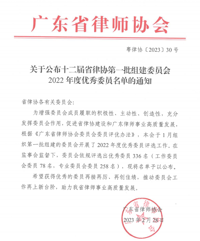 近日,广东省律师协会公布了第十二届省律协第一批组建委员会2022年度优秀委员名单,其中广东诺臣律师事务所(以下简称“诺臣所”)共有6名律师获评,具体名单如下(排名不分先后):