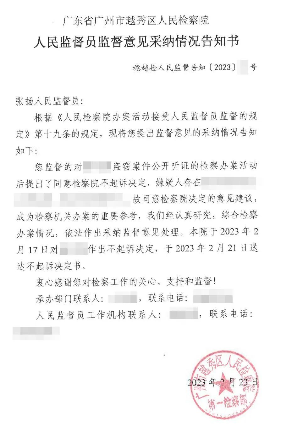 2月27日,张扬律师收到检察院发来的《人民监督员监督意见采纳情况告知书》,告知书称张扬律师提出的监督意见成为检察机关办案的重要参考,监督意见已被广州市越秀区人民检察院依法采纳。