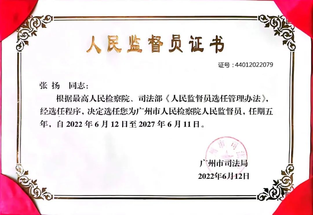 根据《人民检察院审查案件听证工作规定》,检察院办理羁押必要性审查案件、拟不起诉案件、刑事申诉案件、民事诉讼监督案件、行政诉讼监督案件、公益诉讼案件等,在事实认定、法律适用、案件处理等方面存在较大争议,或者有重大社会影响,需要当面听取当事人和其他相关人员意见的,经检察长批准,可以召开听证会,并由人民监督员到场参加听证并提出相应意见。2022年6月,张扬律师第二次被选任成为广州市人民检察院人民监督员,任期五年。