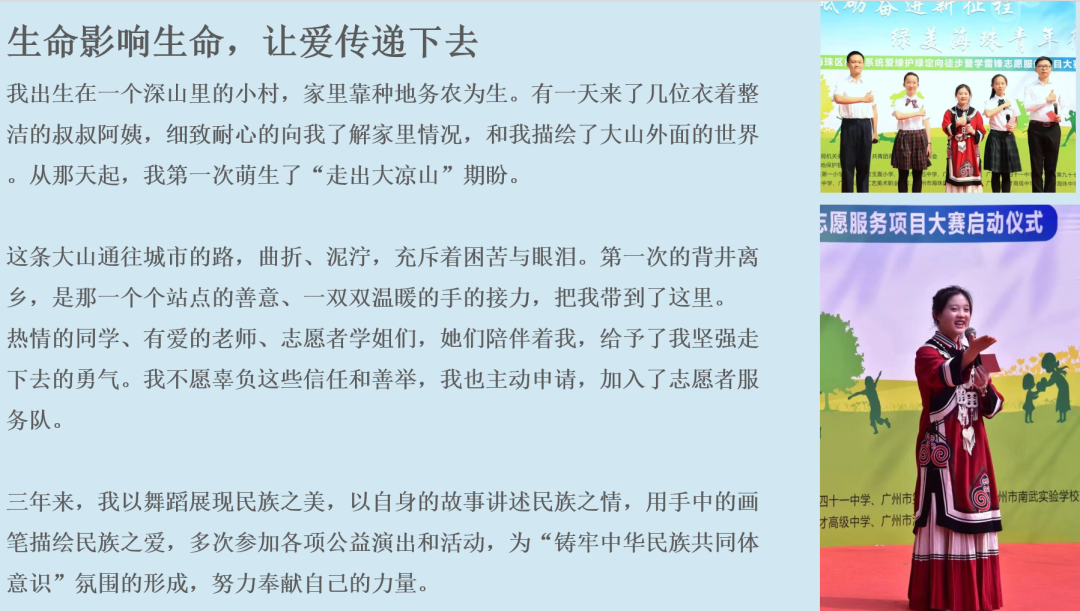 他说,广州是一座温暖的城市。小女孩碧心不幸患白血病,广州发动全城义剪、慈善筹款,举全城之力帮助小碧心。虽然小碧心仍离开了我们,但这支温暖的接力棒传递了下去。广州爱心人士成立了“碧心”慈善组织,帮助了更多孩子“抗白”。郑律师说的没错,广州,就是一座温暖的城市。我们作为广州市的青少年,应当接住“温暖”的接力棒,学习郑律师、学习雷锋,在奉献中实现自己的人生愿景。