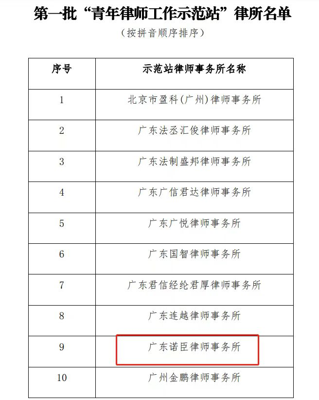 经过申报、评估、考核、公示等阶段,广东诺臣律师事务所(下称“诺臣所”)的青年律师工作获得市律协的认可,最终入选广州市首批10家“青年律师工作示范站”律所名单。