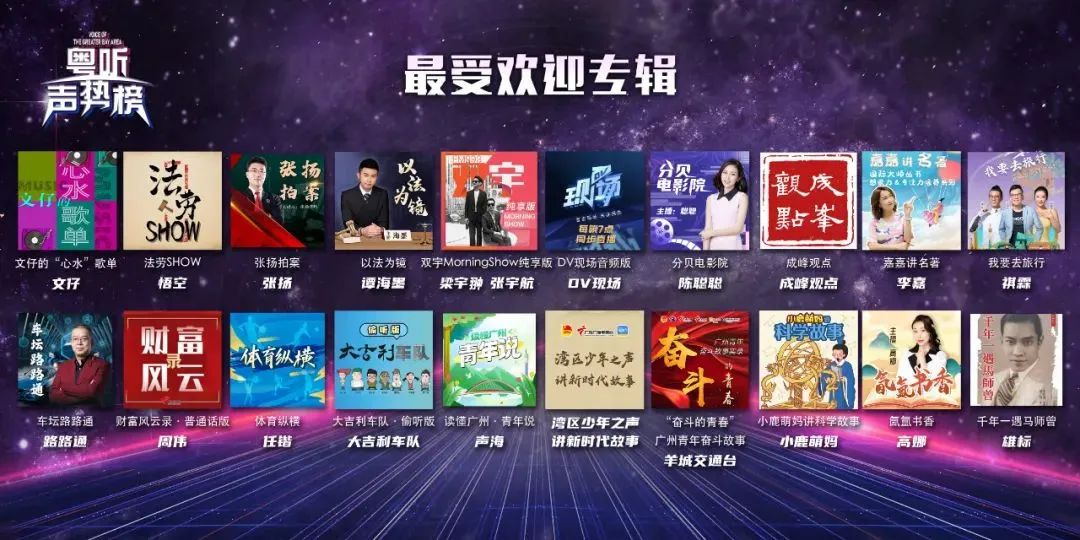 今年,粤听声势榜紧随“人文湾区”建设脚步,积极推动粤港澳三地声音产业的深入交流合作,奖项评选从粤听收听指数到年度媒体关注,扩大评选纬度,升级奖项含金量,评选出“最受欢迎电台节目”、“最受欢迎主播”、“大湾区声势艺人”、“我最喜爱女歌手”、“年度最佳融媒体直播”、“年度最受欢迎专辑”等多个奖项。