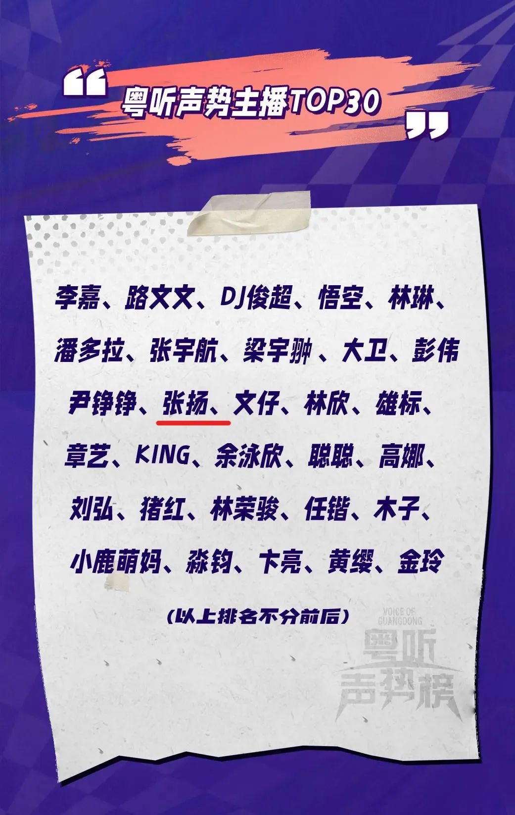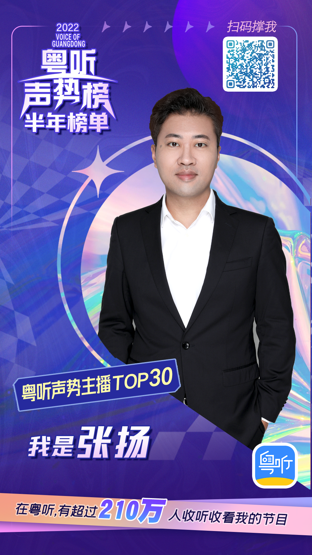 2022年8月,粤听APP曾发布《粤听声势榜2022上半年榜单》,该榜单从综合维度展示了优质融媒节目的排名,榜单包括最佳融媒节目、人气最高电台节目、我最喜爱音乐类主持在内的多个项目,张扬律师被评为“粤听声势主播TOP30”。