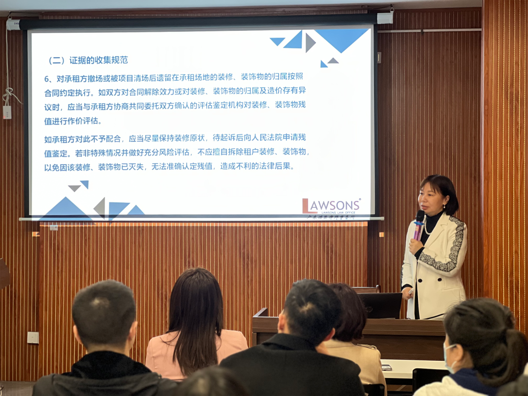 此次培训主题为《商业地产租赁常见问题及风险防控建议》。主讲人曾祥敏律师,结合安居公司的经营模式以及经营交易过程中出现的问题,分别从日常函件发送、证据收集规范、欠款催收规范及费用计算、商户逃铺的处理规范、合规收铺指引、停止物业服务的风险控制、违约解除合同导致的赔偿责任六个方面详细讲述了商业地产租赁常见问题法律风险及防范措施。其中,对于实践中频繁发生的租赁风险,曾律师通过案例分享的方式,深入浅出地向在场职工详细讲解了风险点及应对方式。培训期间与会人员将平时过程中遇到的疑问咨询曾律师,曾律师予以一一解答。曾律师以风趣的语言表达及生动案例向在场职工普及法律知识,获得了在场一致好评。整场培训持续了两个小时。