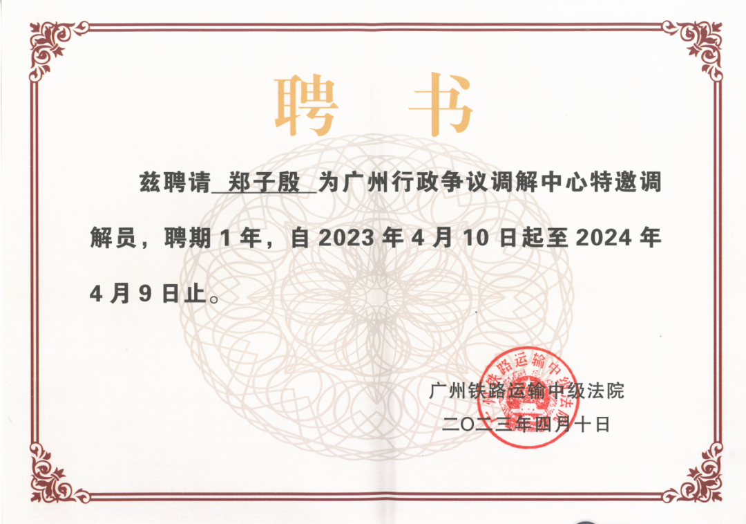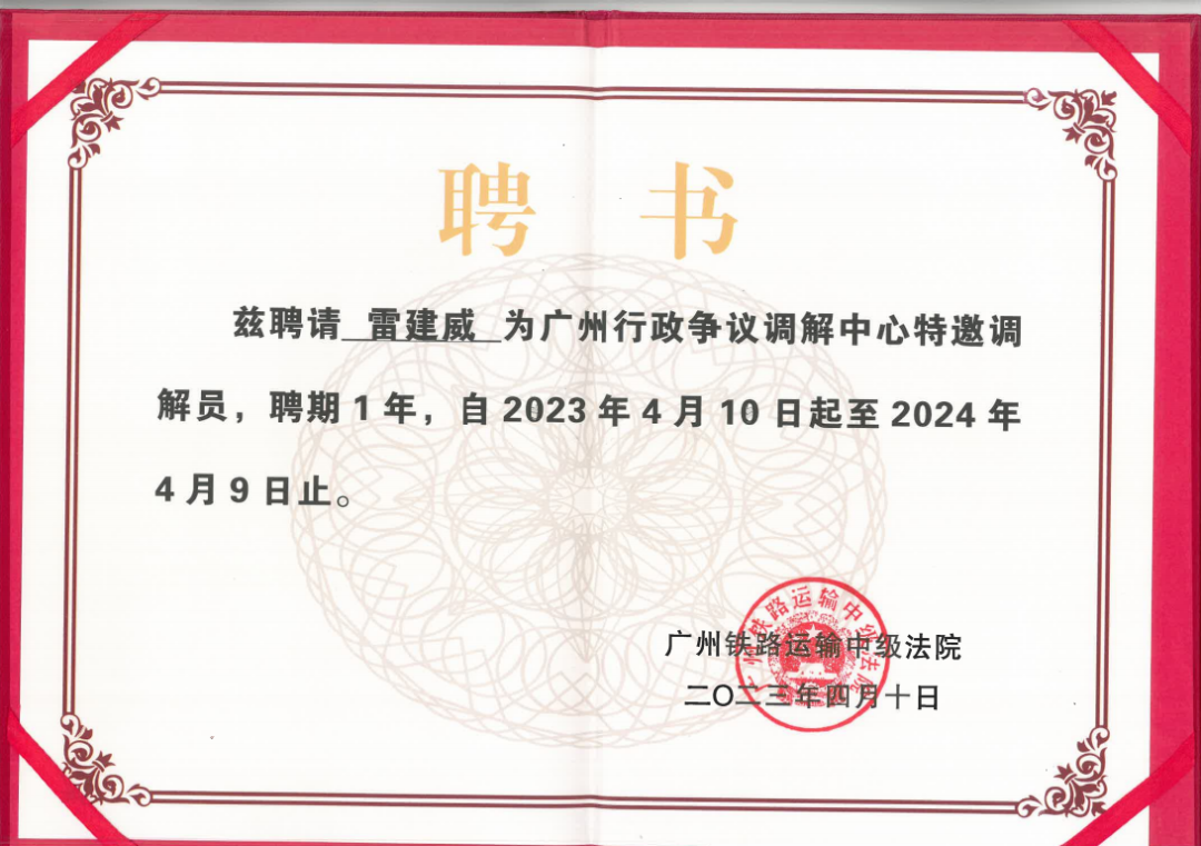 近日,广州行政争议调解中心特邀调解员和特邀调解组织聘任仪式在广东法官学院举行,广东诺臣律师事务所(下简称诺臣所)高级合伙人雷建威律师及郑子殷律师获聘广州行政争议调解中心特邀调解员。