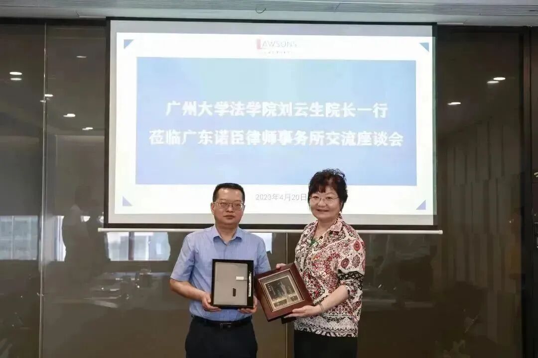 为探索法学人才培养的新方式,2023年4月20日上午,广州大学法学院院长刘云生、副院长李明、学工办主任王文锐到广东诺臣律师事务所(以下简称“诺臣所”)进行参观交流座谈工作。