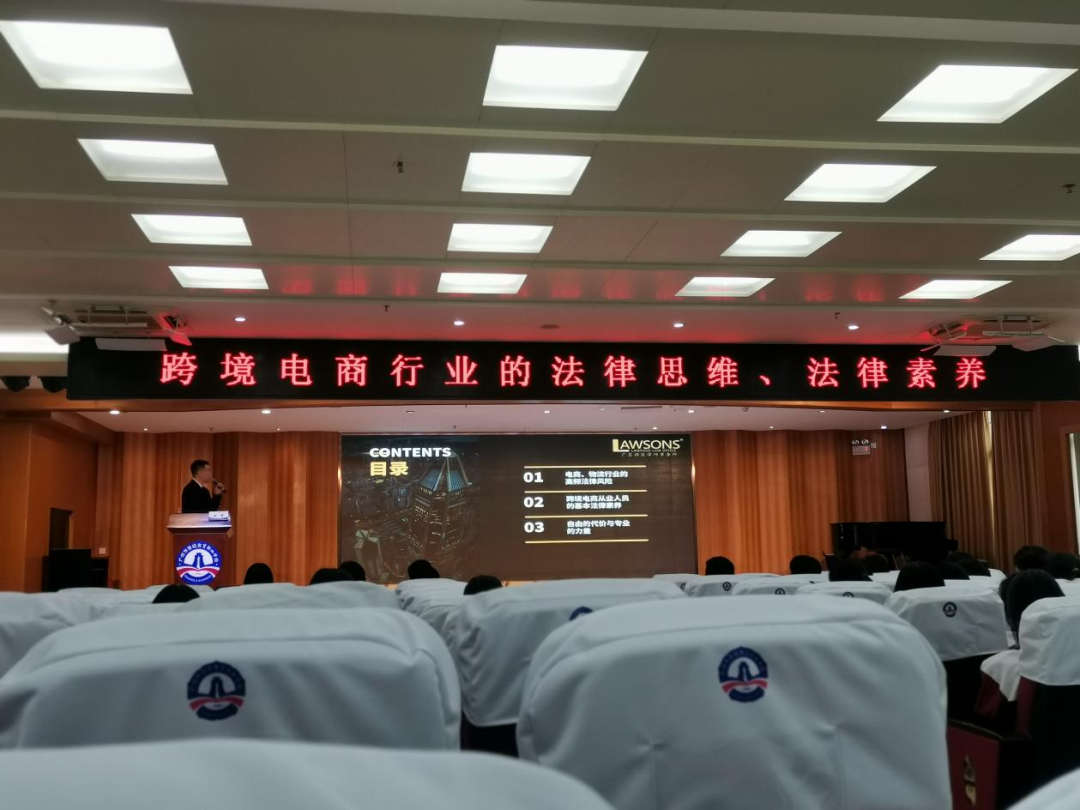 随后,麦佳耀律师团队等一行人到达讲座现场。本次讲座围绕“电商、物流行业的高频法律风险”、“跨境电商从业人员的基本法律素养”、“自由的代价与专业的力量”三个方面展开。首先,由本次讲座主讲人刘律师从当今世界经济形势这一视角出发,结合我国外贸、内需与投资的现状向同学们分析跨境电商行业的发展前景,总结了合同、创业、侵权与违约三个方面的法律风险;其次,结合前述三方面的法律风险,刘律师为同学们讲述了跨境电商从业人员必备的三个素养,即懂市场、懂系统、懂法律;最后,刘律师通过小川诚子的例子,从自由与专业的层面建议同学们今后从事跨境电商或其他行业,都应当具备坚韧的品质和精神。