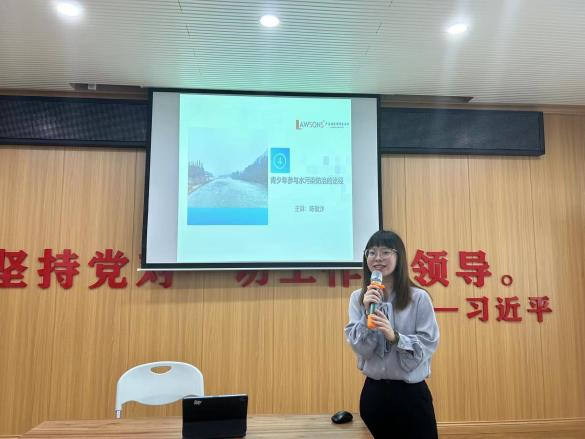 黄宇莹律师依托自己的专业知识和为水务局服务的经验,从水资源保护的意义展开,而后对水资源的法律体系进行了解释,最后结合顺德“以水兴城”的理念和本次活动想向青少年们传播的理念来深入讲解了《中华人民共和国水污染防治法》,让同学们意识到水资源的珍贵以及水污染造成的严重危害。