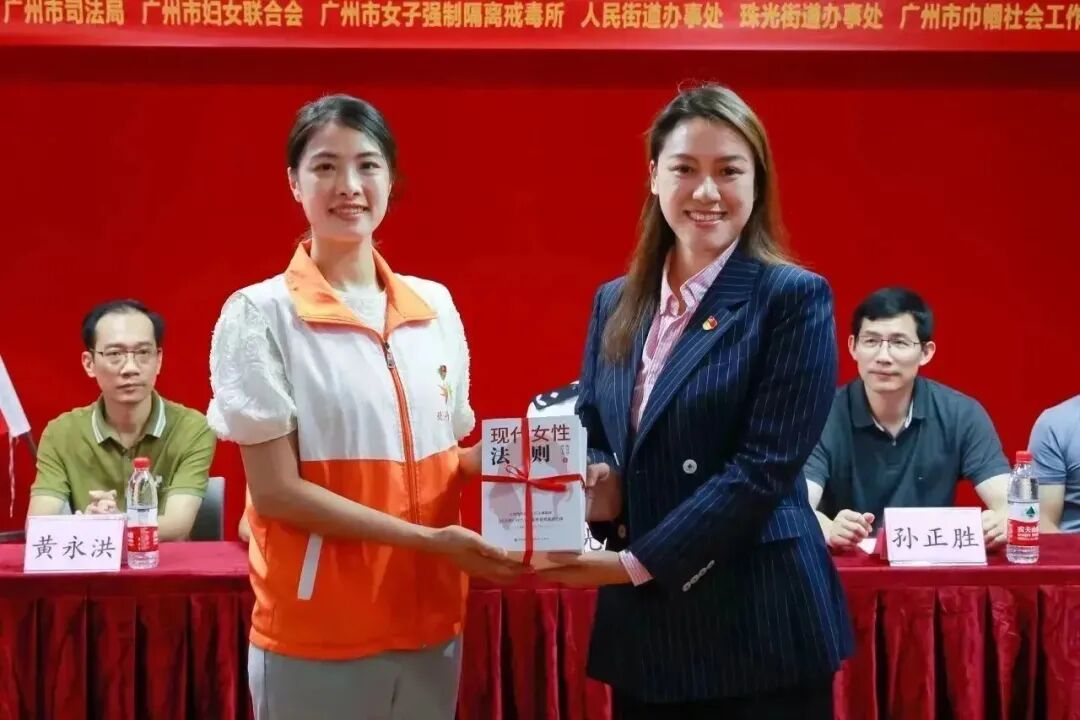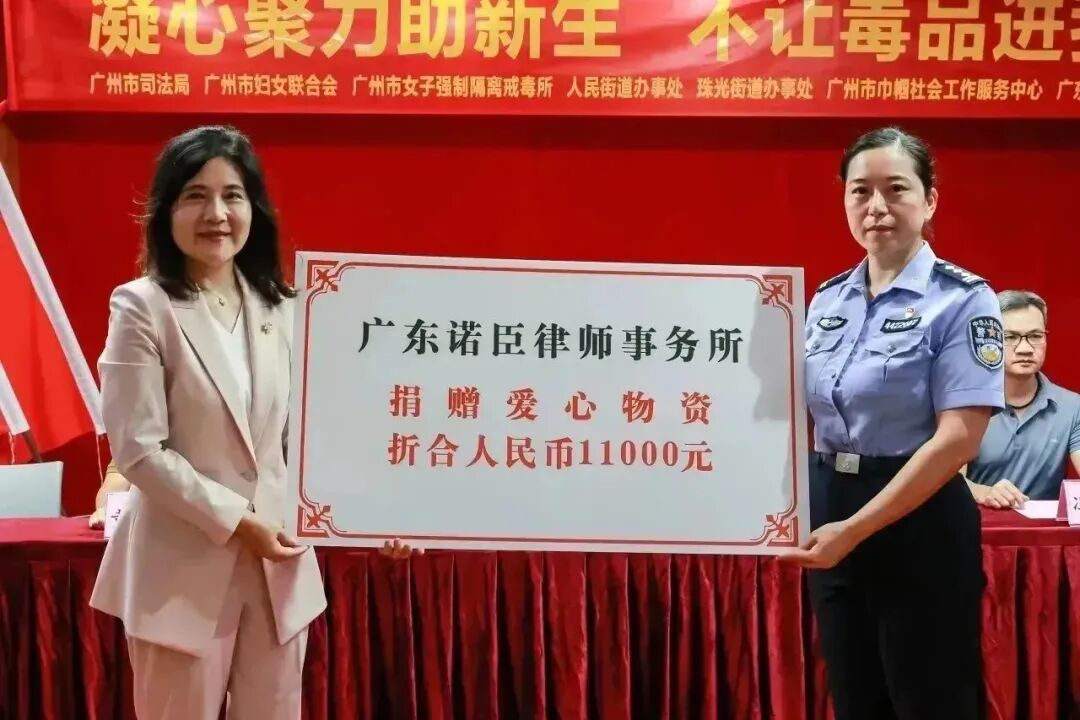 活动现场,王静律师受邀发言,为戒毒康复人员送上祝福,随后由王静律师代表诺臣所向广州市女子所捐赠了价值一万一千元的慰问物资,陈冰华律师也捐赠了由我所黄宇莹律师及陈冰华律师共同撰写的书籍《现代女性法则》,帮助她们更好地知法、懂法、守法、用法。
