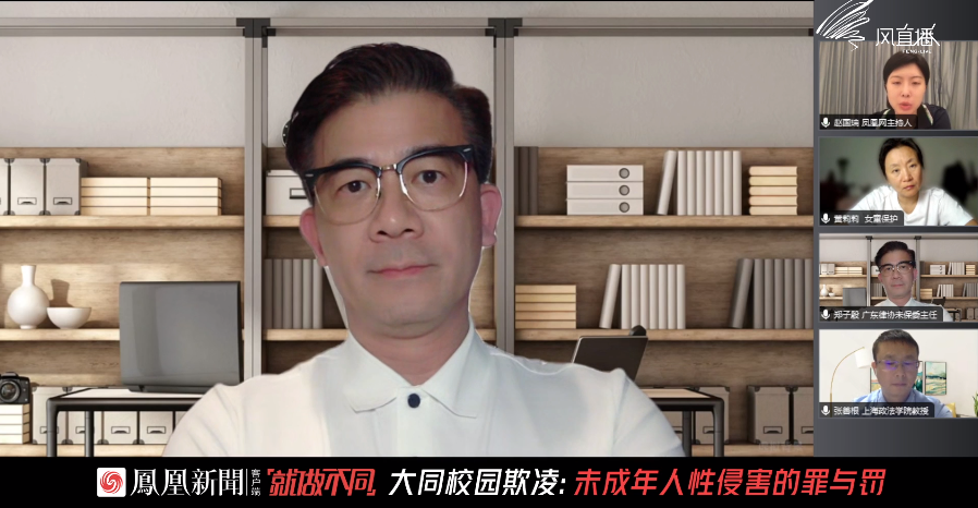 近日,山西大同大成双语学校的未成年人欺凌事件备受关注,其恶性程度令人发指。9月26日当地联合工作组公布了调查情况和处罚措施,但这份通报再次激起舆论,公众普遍认为对欺凌者的处罚太轻了。当晚,广东诺臣律师事务所高级合伙人、广东省律师协会未成年保护委员会主任郑子殷律师受邀参加凤凰网直播,与一众嘉宾探讨未成年人性侵害的罪与罚。