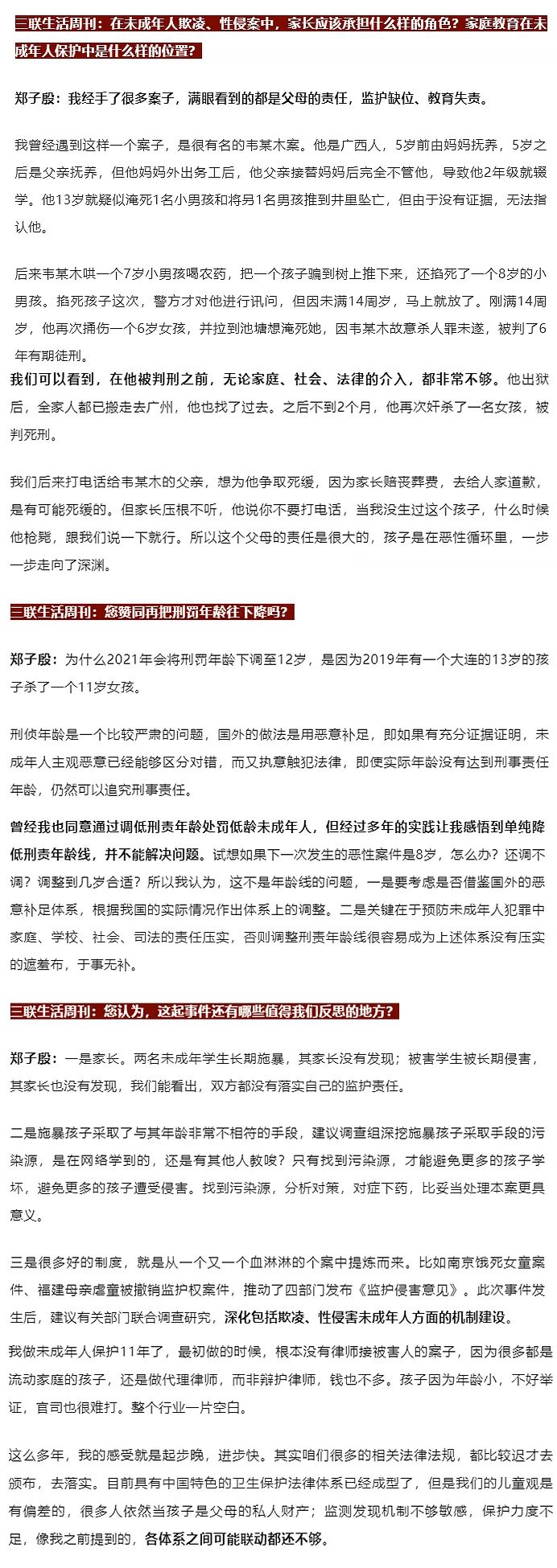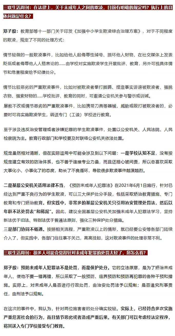 自山西大同大成双语学生欺凌事件发生以来,一直受到公众的广泛关注,大家对未成年人之间发生欺凌或性侵后在法律上该如何认定、怎样定罚等问题产生疑问。近日,广东诺臣律师事务所高级合伙人、广东省和广州市律师协会未成年人保护专委会主任郑子殷律师接受三联生活周刊专访,从法律角度探讨相关问题。