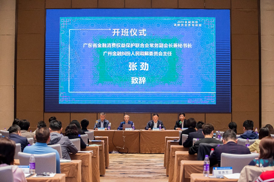 在21日开班仪式上,广州金调委主任张劲为培训人员作了开班致辞,希望各位参训人员能够学有所成,提升业务能力及调解水平,为今后开展调解工作夯实基础。