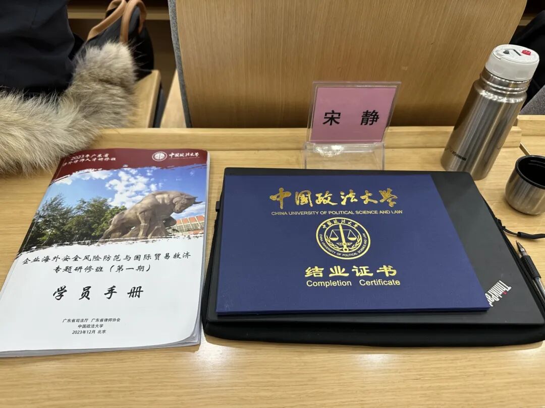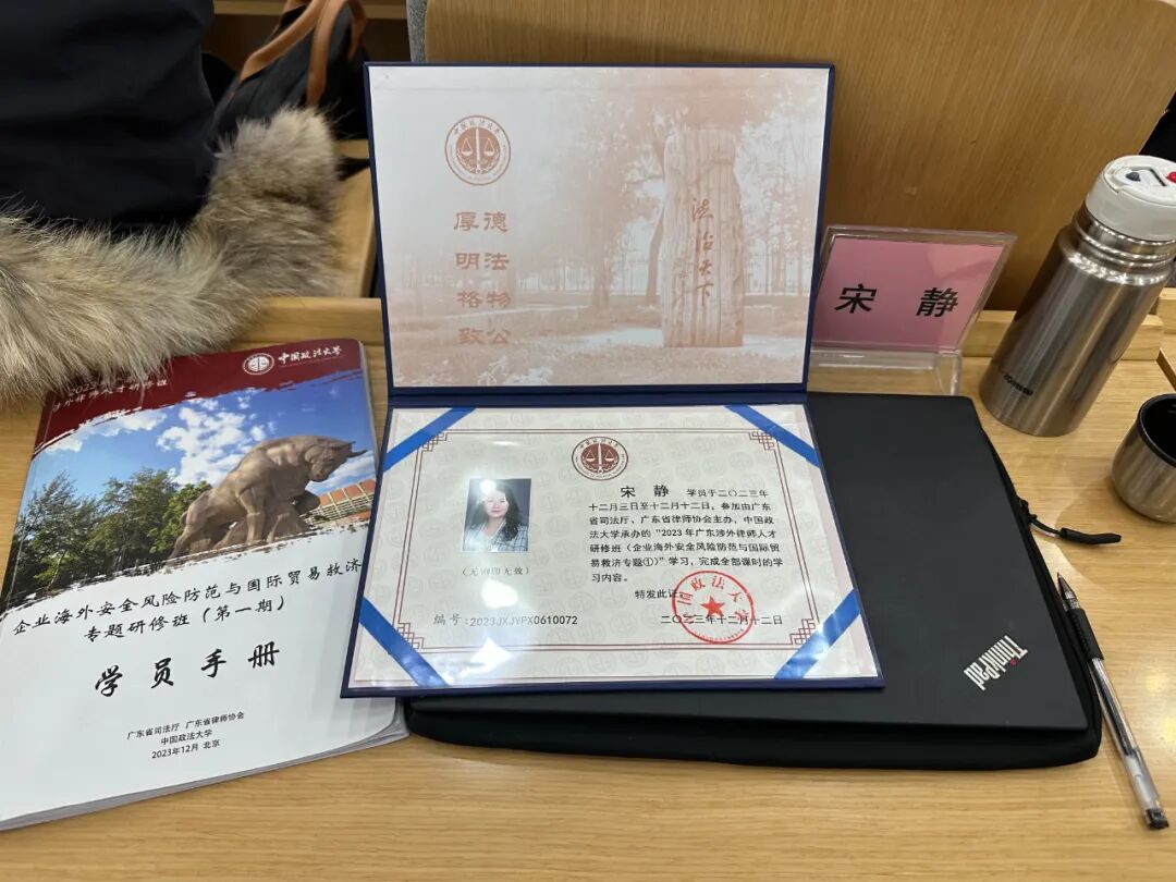 2023年12月12日下午,由广东省司法厅、广东省律师协会主办,中国政法大学承办,为期9天的2023年广东涉外律师人才研修班(企业海外安全风险防范与国际贸易救济专题①)圆满结业。广东诺臣律师事务所宋静律师作为第一期学员,与全省100余名律师一同参加本次培训,并荣获“优秀学员”称号。