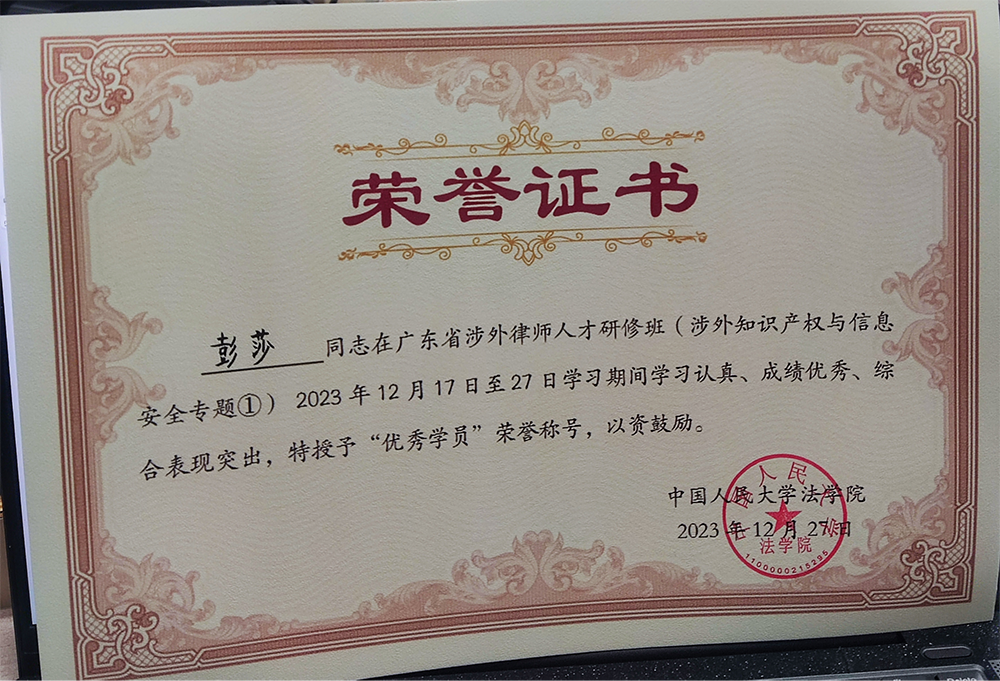 2023年12月27日下午,由广东省司法厅、广东省律师协会主办,中国人民大学承办,为期10天的2023年广东涉外律师人才研修班(涉外知识产权与信息安全专题研修班①)圆满结业。广东诺臣律师事务所(以下简称“诺臣所”)彭莎律师与全省100余名律师一同参加本次培训,并荣获“优秀学员”称号。