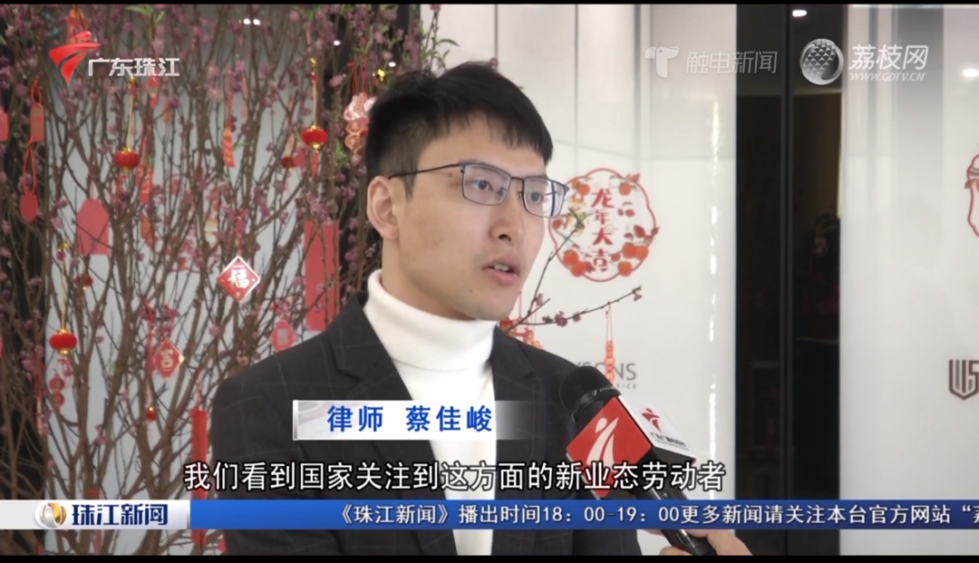 近日,人力资源社会保障部办公厅印发了《新就业形态劳动者休息和劳动报酬权益保障指引》《新就业形态劳动者劳动规则公示指引》《新就业形态劳动者权益维护服务指南》(以下简称《指引指南》),就外卖员、网约车司机等重点群体出台专项权益保障政策,合理界定了企业的劳动保护责任,创新了新就业形态劳动者权益保障制度机制。广东诺臣律师事务所蔡佳峻律师就人社部发布的这三份保障新就业形态劳动者权益文件接受珠江新闻采访。