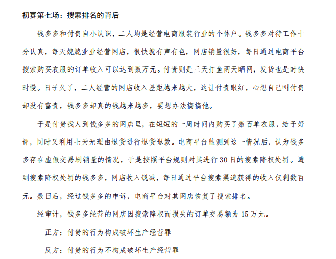 广东诺臣律师事务所辩论队(以下简称“诺臣辩论队”)共有八名成员,分别是合伙人律师车天驰、傅明现,青年律师谢扬、汤昊、蔡佳峻、罗仕杰、黄子峰、陈怡茵。在2号下午的初赛中,诺臣辩论队对战锦天城(广州)辩论队,诺臣辩论队派出一辩陈怡茵律师,二辩汤昊律师,三辩车天驰律师,四辩蔡佳峻律师,双方围绕辩题“付贵的行为是否构成破坏生产经营罪”进行比赛。