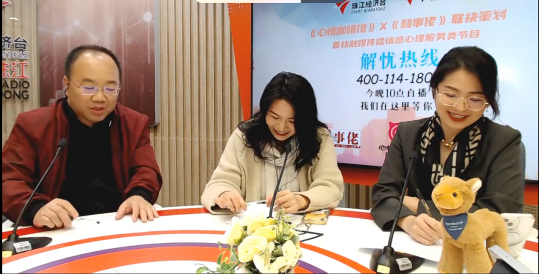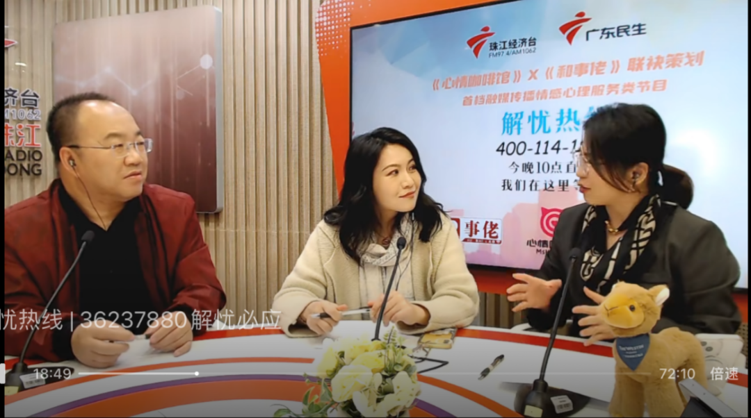 2024年3月14日晚十点至十一点三十分,广东诺臣律师事务所一级合伙人莫春英律师作客广东广播电视台珠江经济台《心情咖啡馆》与《和事佬》联袂策划的首档融媒传播心理情感调解服务类节目之《解忧热线》直播间,与调解专家张耀恩老师、心理学专家迟毓凯教授一起聊民生,说调解。