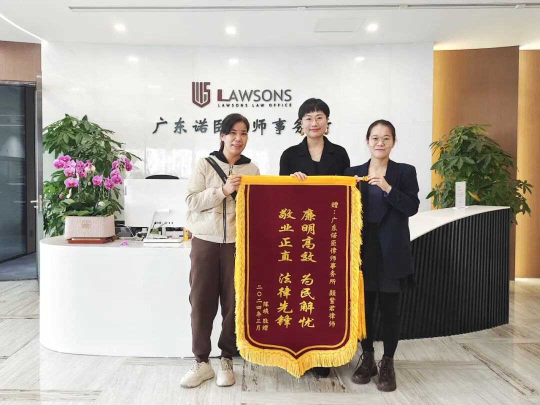2024年3月19日,广东诺臣律师事务所合伙人颜紫君律师及王晓芬律师获赠一面来自当事人的“廉明高效,为民解忧;敬业正直,法律先锋”锦旗,当事人及其家人对颜律师、王律师耐心细致、专业负责的态度表达了感激和赞赏。