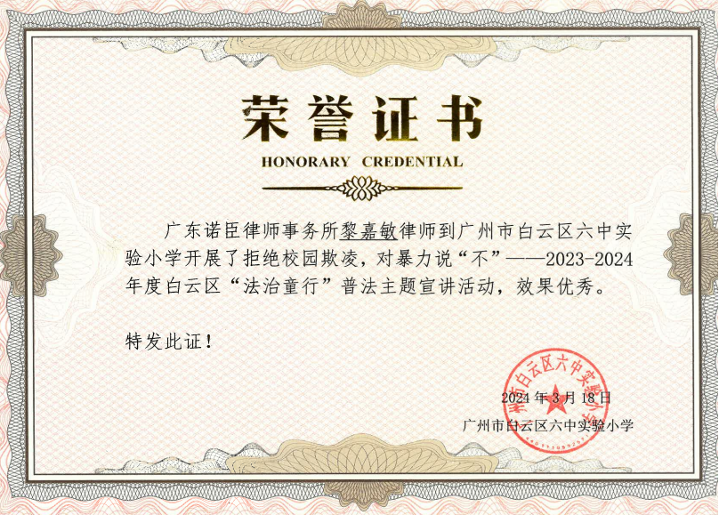 本次“拒绝校园欺凌,对暴力说‘不’”宣讲活动的开展,不仅提升了学生的法治意识和安全防范意识,为在校学生营造了良好的成长环境和氛围,更培养了师生学法、知法、懂法、守法、用法意识,共建平安校园,共创和谐社会。宣讲结束后,学校为黎嘉敏律师颁发了荣誉证书。