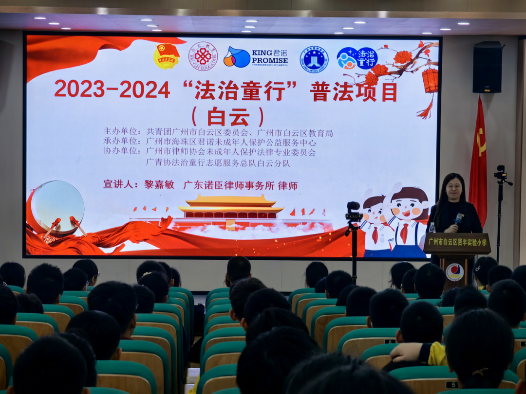 2024年3月21日,黎嘉敏律师收到广州市白云区贤丰实验学校的邀请,为该校四到六年级680名学生开展“学习网络安全知识,谨防网络危害”专题普法讲座。